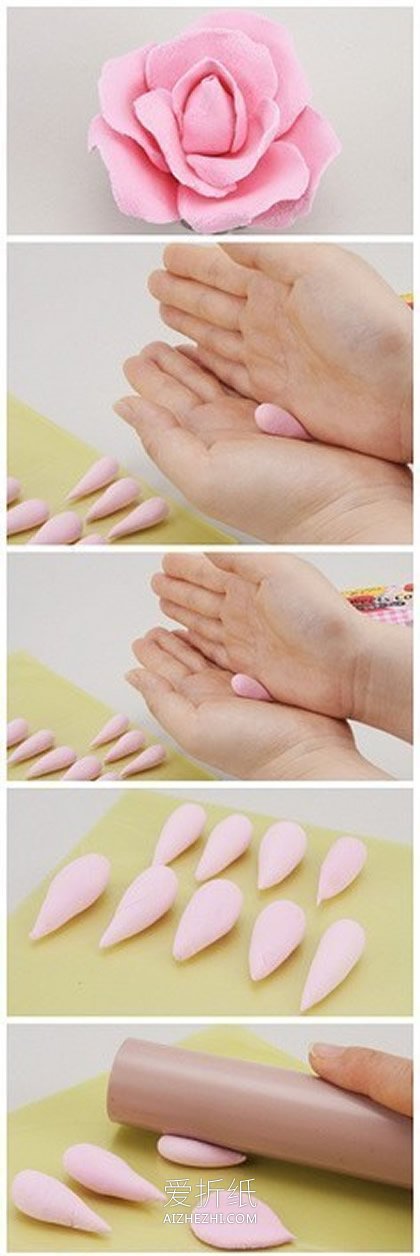超轻粘土制作玫瑰花的图解教程,选择粉色的粘土,先做出很多的雨滴形状,然后压扁做出花瓣。