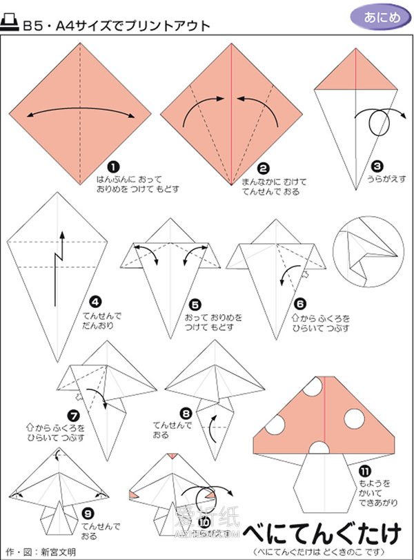 先把双色纸剪裁成正方形,然后跟着上面的步骤图完成小蘑菇折纸!