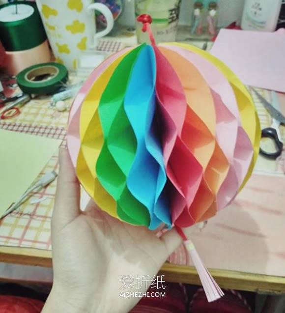 10、把彩纸都如图打开,安装上穗子,一个漂亮的纸彩球就制作完成了!