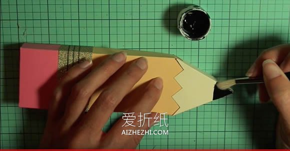 从浅黄色卡纸上剪出纸片,粘贴到铅笔头部位。