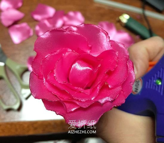 最后调整花瓣的造型,可以点胶固定,一朵美丽的缎带牡丹花制作完成!
