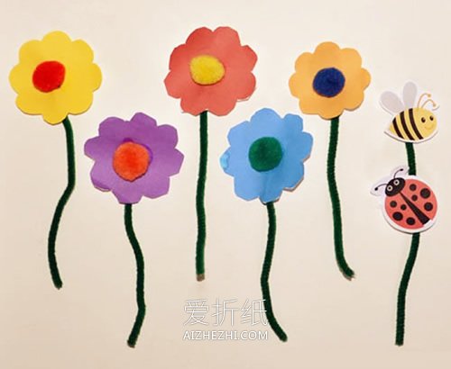 然后用卡纸剪出小花、蜜蜂、瓢虫,背面贴上绿色扭扭棒,其中小花中心还要贴上彩色毛绒球。