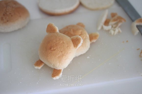 用面包制作小熊汉堡的方法图解,不但味道可口,还非常有观赏价值。思路很简单,从面包上切出小熊的耳朵、四肢等,再用牙签插到大块面包上即可。超简单的食物DIY,大家吃的时候可要小心牙签!